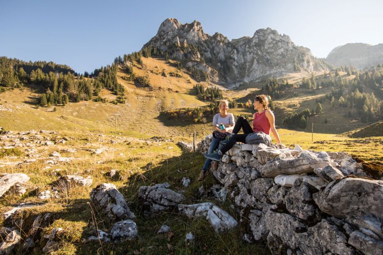 Wenig später erreicht man das Naturschutzgebiet Breccaschlund – eine Urlandschaft, die 1996 ins Bundesinventar der Landschaften und Naturdenkmäler von nationaler Bedeutung aufgenommen wurde. Ein spezieller Zauber geht von den imposanten Kalksteinwänden aus, die ihre weissen Zacken aus dem saftigen Grün der Alpweiden himmelwärts recken. Zwischen diesen Spitzen, von der Pointe de Balachaux (1977 m) im Südwesten bis zur Spitzflue (1954 m) im Osten, fühlt man sich beschützt – oder auch etwas gefangen.