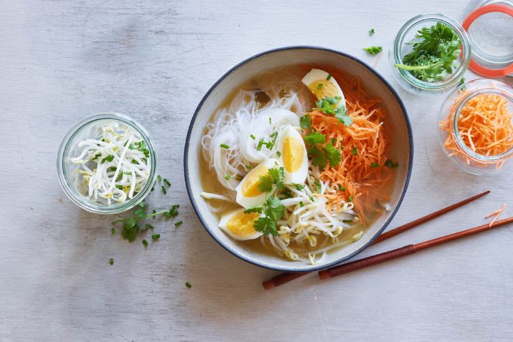 Als Lieferant für Kohlenhydrate dienen Glas-, Ramen- und Reisnudeln. Eier, Tofu und Poulet bringen die Proteine in die Suppe. Pak-Choi, Mungobohnensprossen, Rüebli und Frühlingszwiebeln sorgen für die entsprechende Gemüsebeilage. Typisch asiatische Zutaten und Gewürze wie Zitronengras, Koriander, Ingwer, Chilischoten, Sojasauce und Sesamöl bringen die asiatischen Suppen zur Vollendung. Probiere unsere Suppen und geniesse den Ausflug nach Fernost.