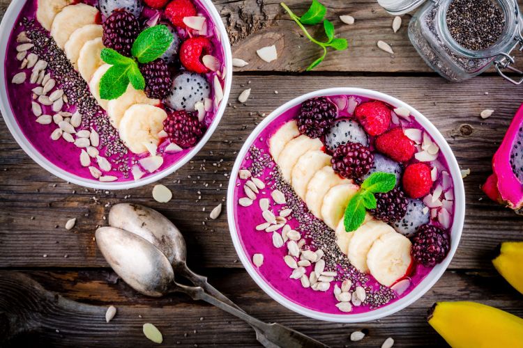 Bei süssen Bowls können Zutaten wie Acai, Banane, Himbeeren, Heidelbeeren, Granatapfel, Avocado, Mango, Kiwi, Apfel, Physalis zum Beispiel mit Joghurt, Haferflocken oder Porridge kombiniert werden. Superfoods wie Chiasamen, Goji-Beeren, Leinsamen oder Kakaosplitter passen ebenfalls perfekt.