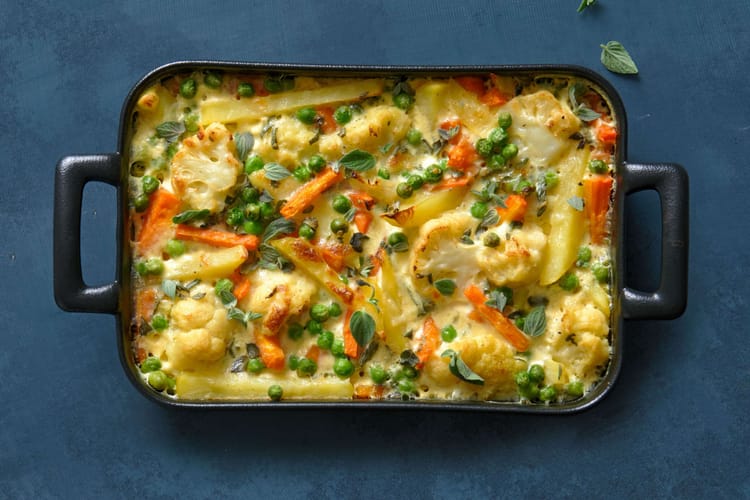 Bouillon aufkochen. Gemüse und Kartoffeln in der Bouillon 8–10 Minuten blanchieren. Mit einer Lochkelle herausheben und mit den Erbsen in eine grosse Gratinform geben.