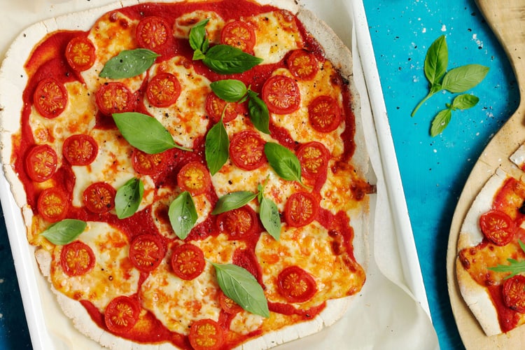 Der Pizza-Klassiker aus Italien: Auf den Teig der Margherita kommen Tomaten, Käse und Basilikum. In Stücke geschnitten auch als Party-Fingerfood ein Hit.