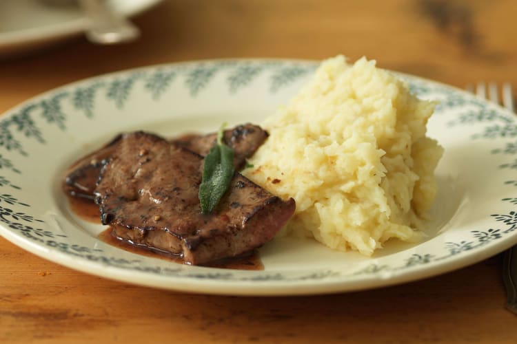 Salbeiblätter von den Zweigen zupfen. Zwiebel hacken. Öl in einer beschichteten Pfanne erhitzen. Salbeiblätter kurz braten, herausnehmen und beiseitestellen. Zwiebel in derselben Pfanne anbraten. Leber portionenweise dazugeben und ca. 2 Minuten mitbraten. Leber salzen. Herausnehmen und zugedeckt beiseitestellen. Bratsatz mit Bouillon und Madeira ablöschen. Senf dazurühren. Sauce mit Salz und Pfeffer abschmecken. Leber zur Sauce geben. Mit Selleriepüree anrichten. Mit Salbei garnieren.