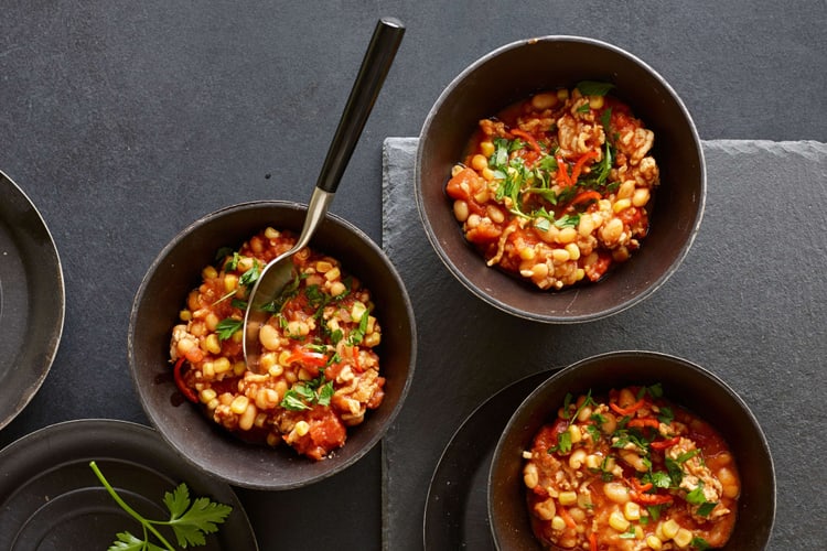 Den Südstaaten-Klassiker kann man auch mit Geflügelhackfleisch zubereiten. Chilischoten, Zwiebeln, Tomaten, Mais und weisse Bohnen dürfen nicht fehlen.