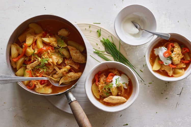 In einer beschichteten Pfanne im Öl rundum scharf anbraten, Zwiebeln und Peperoni kurz mitbraten. Tomatenpüree dazugeben. Alles mit Bouillon ablöschen. Mit Paprika und Gewürzmischung würzen. Ragout zugedeckt bei kleiner Hitze ca. 10 Minuten köcheln.