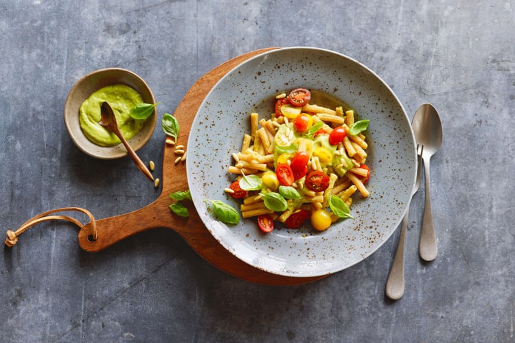 Sauce mit wenig Kochwasser verdünnen. Einen Teil der Avocadosauce mit Teigwaren und Tomaten mischen. Rest darauf verteilen. Mit Pinienkernen und Basilikumblättchen garnieren.