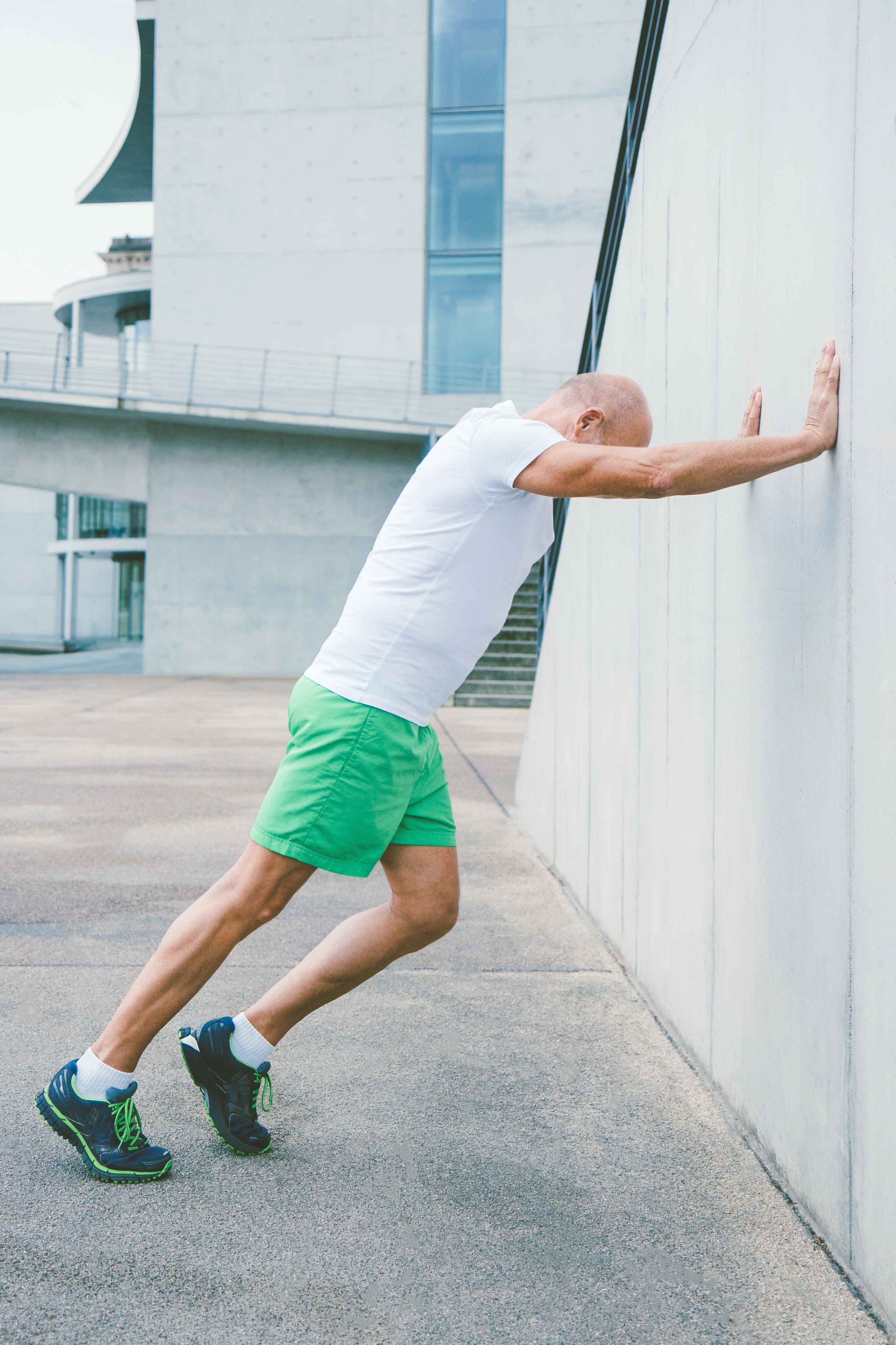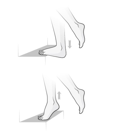 Um nicht nur in den passiven Strukturen zu hängen, kann man bei der bekannten Wadendehnung über den Treppenrand sich über die Zehen wieder nach oben drücken und so ein Krafttraining integrieren. Dabei kann die Schwierigkeit von beidbeinig auf einbeiniges «Wadenpumpen» gesteigert werden. Dabei können täglich 2-3 Serien à 20-30 Wiederholungen notwendig sein.