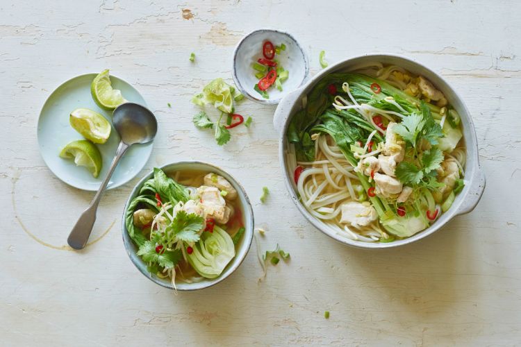 Notre «soupe de poulet express» est prête en 20 minutes. Équilibrée, elle apporte 620 kcal par portion et est donc aussi idéale pour le souper en semaine. Laissez-vous tenter par cette soupe savoureuse à l’émincé de poulet accompagné de nouilles de riz, de pousses de haricots mungo et de pak-choï! La coriandre, l’huile de sésame et le citron vert viennent lui apporter une délicieuse note asiatique.