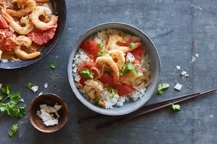 Quick & easy: vite prête, parfaite pour le soir, cette salade est simple et savoureuse. Riz basmati, crevettes, grapefruit, morceaux de coco, harmonieux.