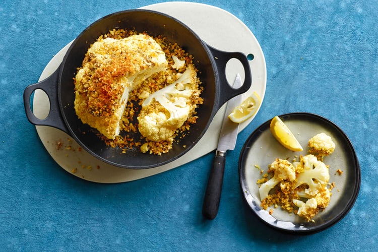 Rôti entier, ce chou-fleur se pare des belles notes d'une chapelure au basilic et du petit plus acidulé du citron qui l’accompagne. Se décline aussi végan.