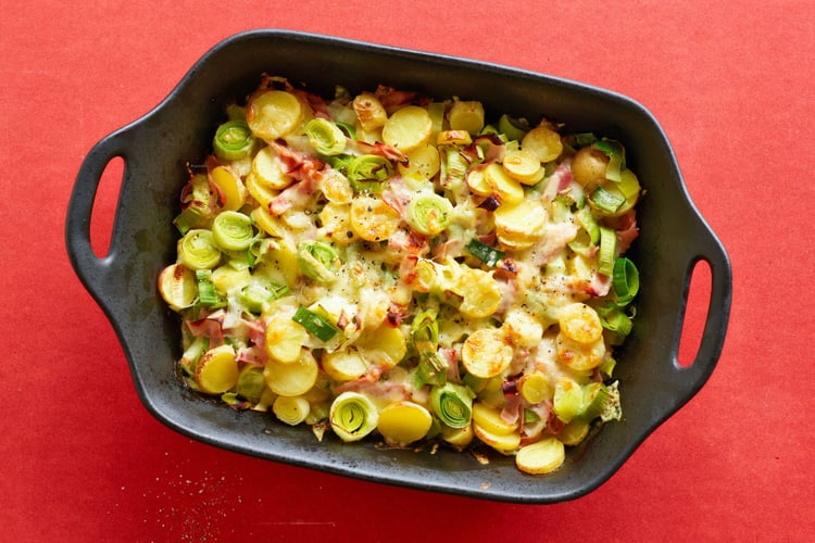 Cuire les pommes de terre dans de l'eau salée env. 5 min jusqu'à ce qu'elles soient à peine tendres. Ajouter le poireau et poursuivre la cuisson 1 min. Égoutter, mélanger avec le jambon et la moitié du fromage.