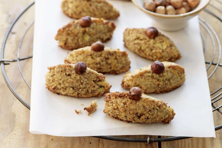 Préchauffer le four à 180 °C, chaleur de voûte et de sole. Séparer les blancs des jaunes d’œuf. Faire fondre le beurre. Mélanger les jaunes d’œuf, le sucre, les noisettes moulues et le beurre. Râper fin le zeste du citron par-dessus. Monter les blancs d’œuf en neige. Couper la pomme en petits dés, peau comprise. Incorporer les blancs d’œuf, la pomme et la farine. A l’aide de deux cuillères former env. 16 quenelles et les disposer sur une plaque chemisée de papier sulfurisé. Les décorer d’une noisette entière puis glisser le tout au milieu du four et laisser cuire env. 15 min.