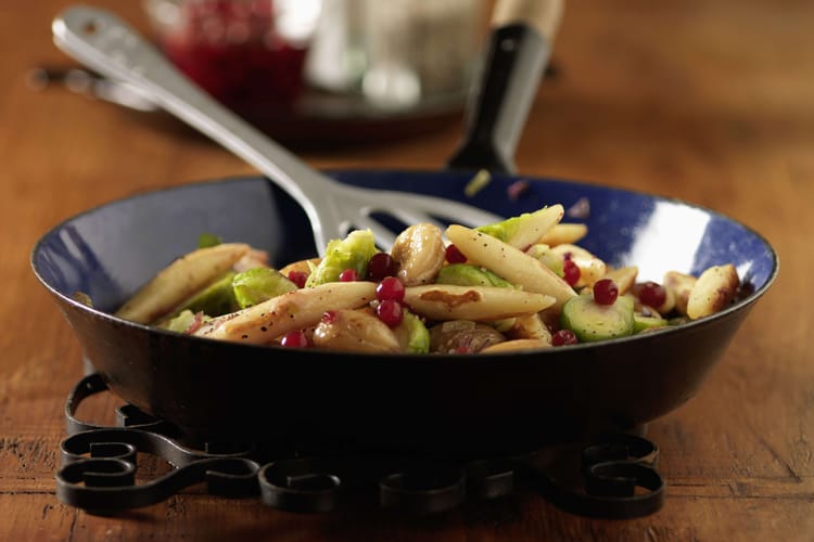 Un plat copieux et réconfortant pour les fraîches journées d'automne: poêlée de schupfnudeln aux choux de Bruxelles, châtaignes, oignons rouges et airelles.