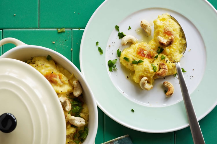 Faire dorer à sec les noix de cajou et les réserver. Hacher le persil. Couper les abricots en deux. Porter à ébullition le bouillon et le lait. Ajouter la semoule de maïs et les abricots et poursuivre la cuisson à feu moyen durant env. 5 min. Râper le fromage par-dessus. Relever de sel et de poivre. Dresser la polenta et la parsemer de persil et de noix de cajou. Idéal avec une salade verte.