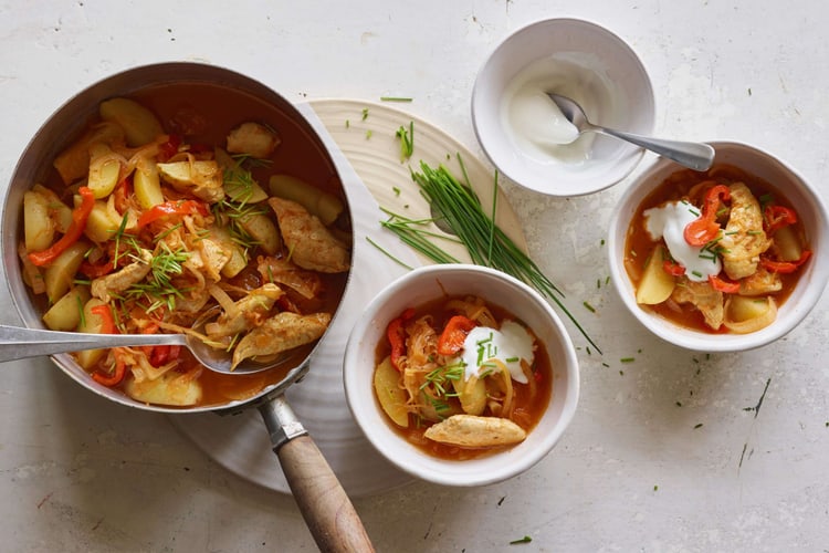 Dans une casserole antiadhésive, saisir de toutes parts la viande à feu vif dans l’huile puis ajouter les oignons et le poivron et poursuivre brièvement la cuisson. Incorporer le concentré de tomates puis mouiller avec le bouillon. Assaisonner de paprika et de mélange d’épices. Couvrir et laisser mijoter env. 10 min à petit feu.
