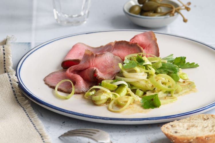 Dresser le rosbif et la salade. Idéal avec des câprons et une baguette croustillante.
