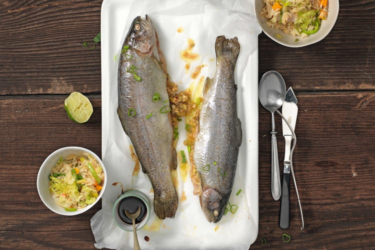 Les truites sont farcies de gingembre, lemon-grass, oignons, ail, citron vert, huile et sauce soja puis cuites au four. Divin avec du riz poêlé aux légumes.