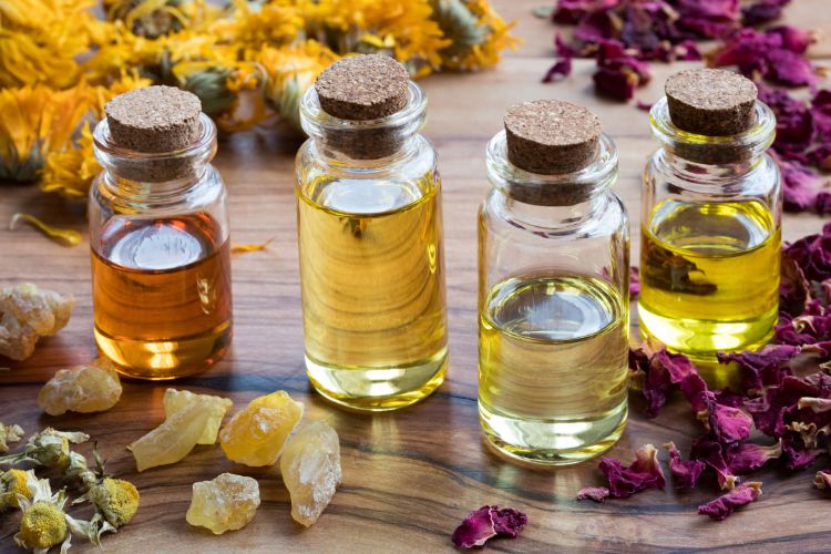 Les huiles de base sont souvent complétées d’huiles essentielles. Ces substances volatiles et agréablement parfumées s’obtiennent à partir de fleurs, de feuilles, de graines, de bois ou de racines de plantes. Elles possèdent fréquemment des vertus thérapeutiques et peuvent avoir une action relaxante, anti-inflammatoire, antibactérienne, vivifiante ou stimulante pour la circulation sanguine.