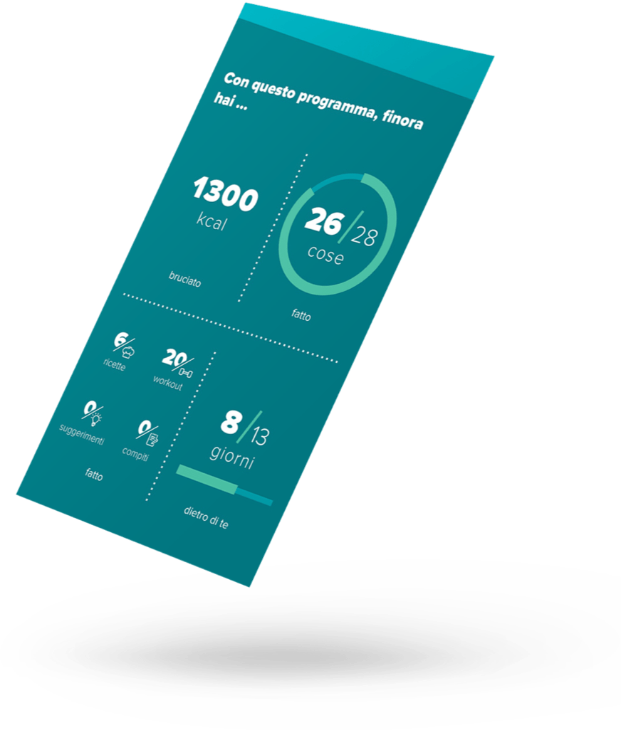 Ogni giorno ricevi nuovi impulsi dai settori "alimentazione", "attività fisica", "rilassamento" e "medicina" sotto forma di schede contenenti informazioni sulle ricette e gli allenamenti / esercizi sportivi, consigli e compiti da svolgere.