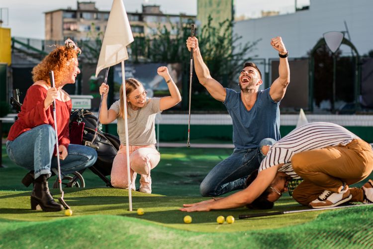 Giocare a golf senza avere il permesso di accesso al campo e senza rispettare il dress code? È possibile! FunGolf è rivolto a tutti coloro che desiderano provare il golf in modo informale. Non è necessario avere il permesso di accesso al campo né un handicap. È adatto, per esempio, a eventi di team o a feste di compleanno, in cui giocatori esperti e principianti si incontrano.
