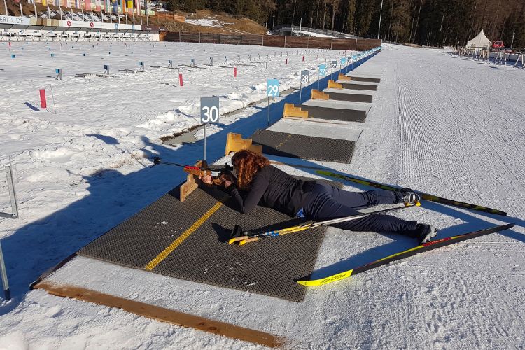 Quello che mi affascina del biathlon è la varietà: le atlete si sono appena sfiancate sulla pista da fondo e, con le pulsazioni a 170, vanno al poligono di tiro: riposti i bastoncini, si mettono in ginocchio, sfilano il fucile dalla schiena e si sdraiano a terra. Con mano ferma bisogna quindi sparare su cinque bersagli a 50 metri di distanza. Per la posizione a terra, il diametro di ogni bersaglio misura 4,5 cm – quanto il tubo di un rotolo di carta igienica.