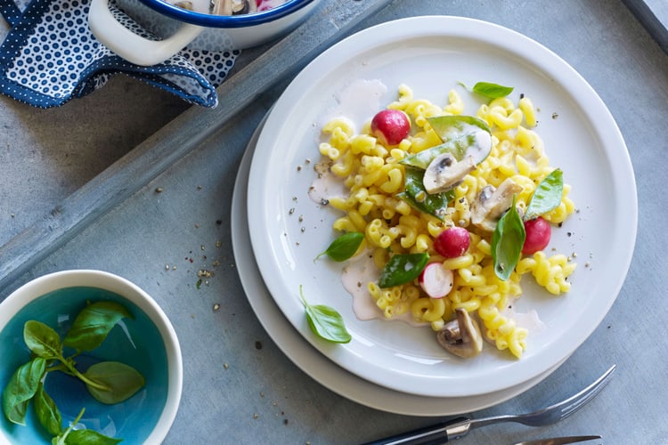 Scaldate l’olio in una padella e soffriggetevi le taccole e i funghi per 2-3 minuti mescolando di tanto in tanto. Aggiungete i ravanelli e soffriggeteli brevemente. Unite il brodo e la panna. Fate sobbollire per ca. 1 minuto. Aggiungete la scorza di limone grattugiata e le foglie di basilico spezzettate. Condite con sale, pepe e poco succo di limone. Mescolate con la pasta e servite.