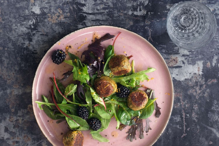 Preparate i falafel seguendo le indicazioni sulla confezione. Formate 12 polpette della stessa grandezza con l’impasto. Scaldate l’olio di colza in una padella antiaderente. Rosolatevi i falafel a fuoco medio per ca. 5 minuti. Grattugiate la scorza d’arancia e spremete il succo. Mescolate la scorza e un po’ di succo con l’olio d’oliva, l’aceto, sale e pepe. Mescolate l’insalata con le more e condite con la vinaigrette all’arancia. Servite l’insalata con i falafel.